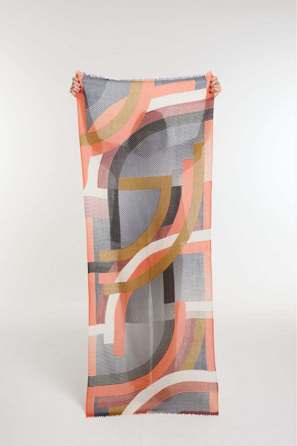 Imprimé sur une laine fine, le foulard Alchimie dévoile un motif subtil où les courbes franches dialoguent avec des lignes délicates qui forment un fond raffiné.