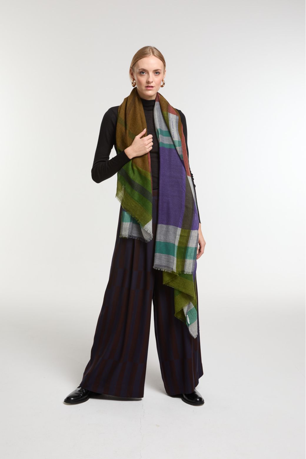 Composé d’un tissage minutieux, il met en lumière un jeu de color-block imprimé qui fait vibrer les nuances de manière délicate.