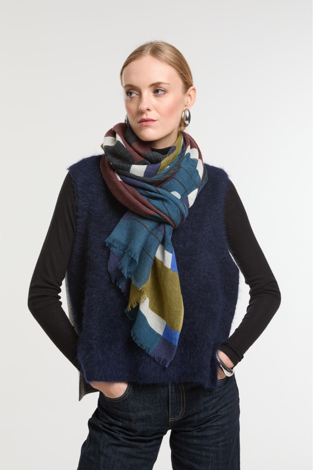 Imprimé au cadre sur une laine fine, le foulard Petra se distingue par son motif résolument structuré, où les formes s’emboîtent avec une précision élégante.